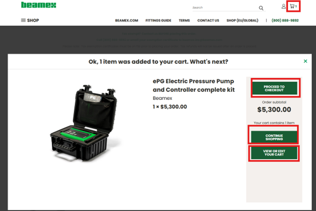 After you have added the product to cart, you have the choices to view the Cart, Proceed to Checkout, or to continue shopping.